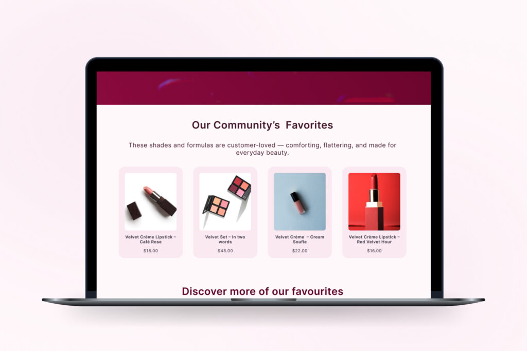 Nous avons imaginé une expérience en ligne immersive pour In Velvet Red, une marque de beauté romantique inspirée des rituels de café, du soft glam et de l’expression de soi tout en douceur. Du ton de marque à la présentation des produits, chaque détail a été pensé pour évoquer une gorgée chaleureuse et sucrée.